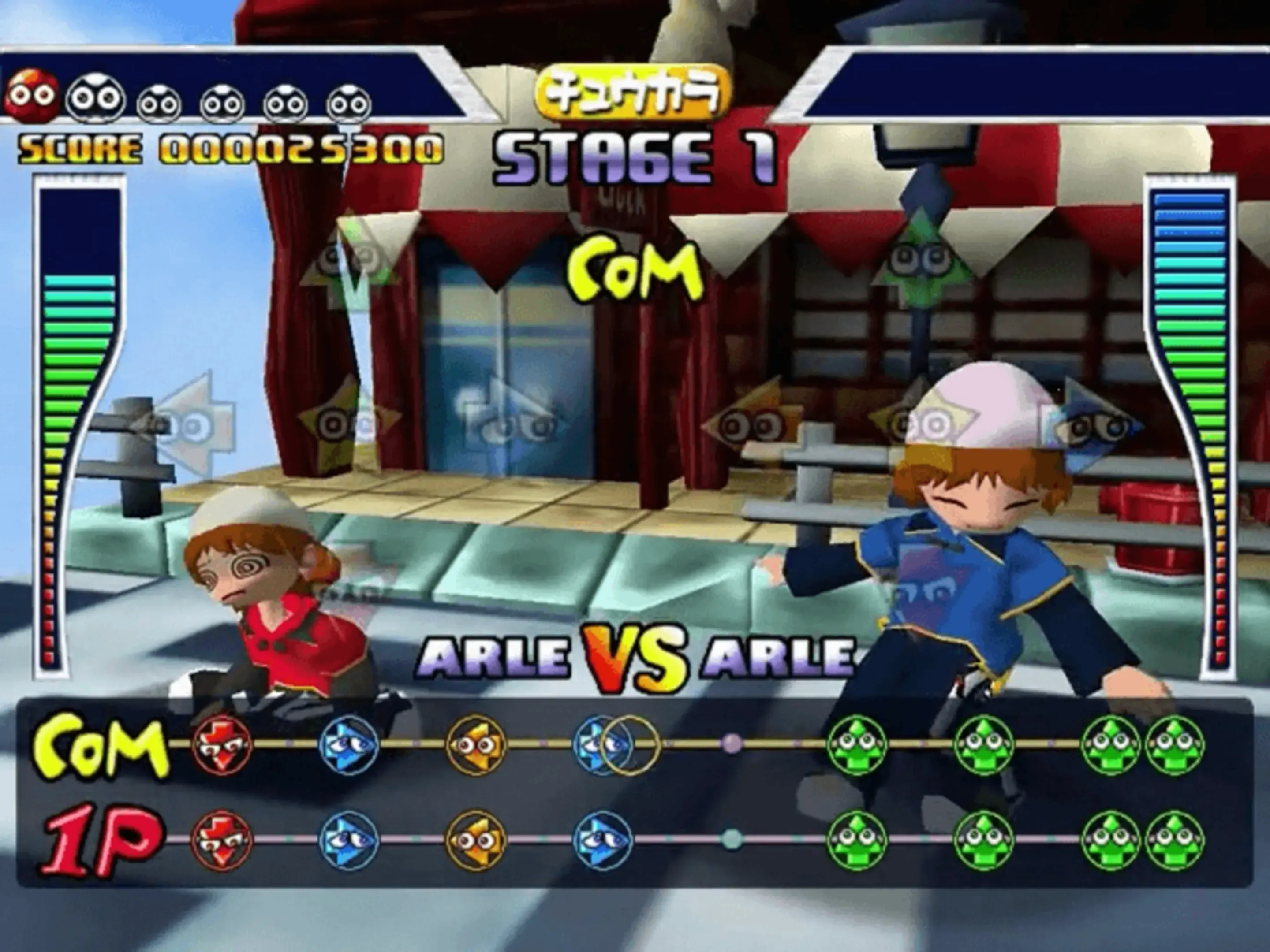 Arle Nadja and her friends take some time off from Puyo fighting and challenge players to dance with them. The game features several dance stages, similar to games such as Space Channel 5 and PaRappa the Rapper. It also introduces a new ELLENA system used to render the game as well as a new exclusive character featuring the same name (Ellena Stevens, the protagonist of the original Broadway Legend Ellena featuring Park Jin-young). One or two players can dance to a variety of J-pop tunes by using the controller buttons to copy their opponent's moves. Based on how well a player copies the moves, Nuisance Puyos are sent to their opponent. The player loses if their health bar drops to 0, or if they have Nuisance Puyos on their side of the screen.