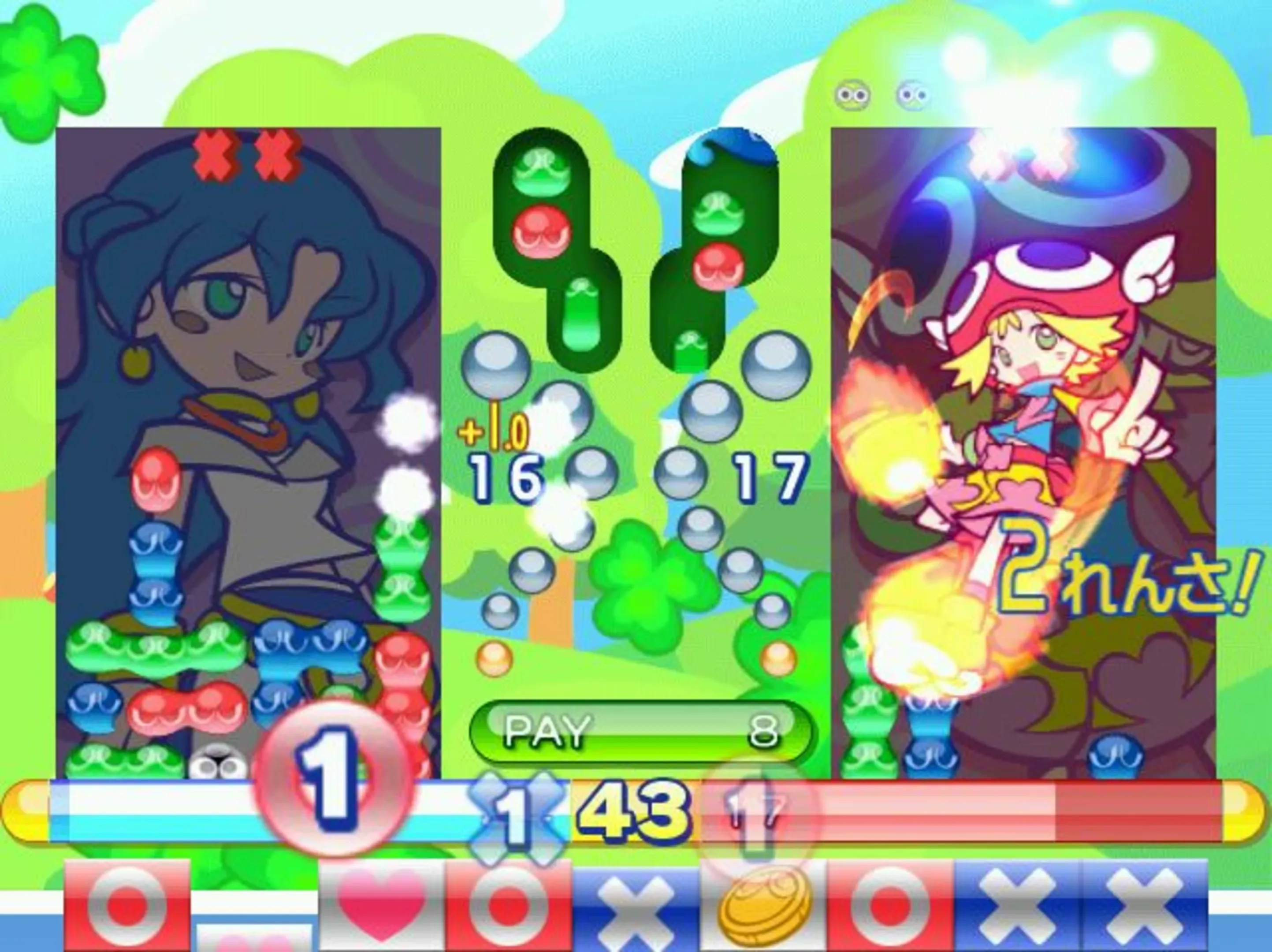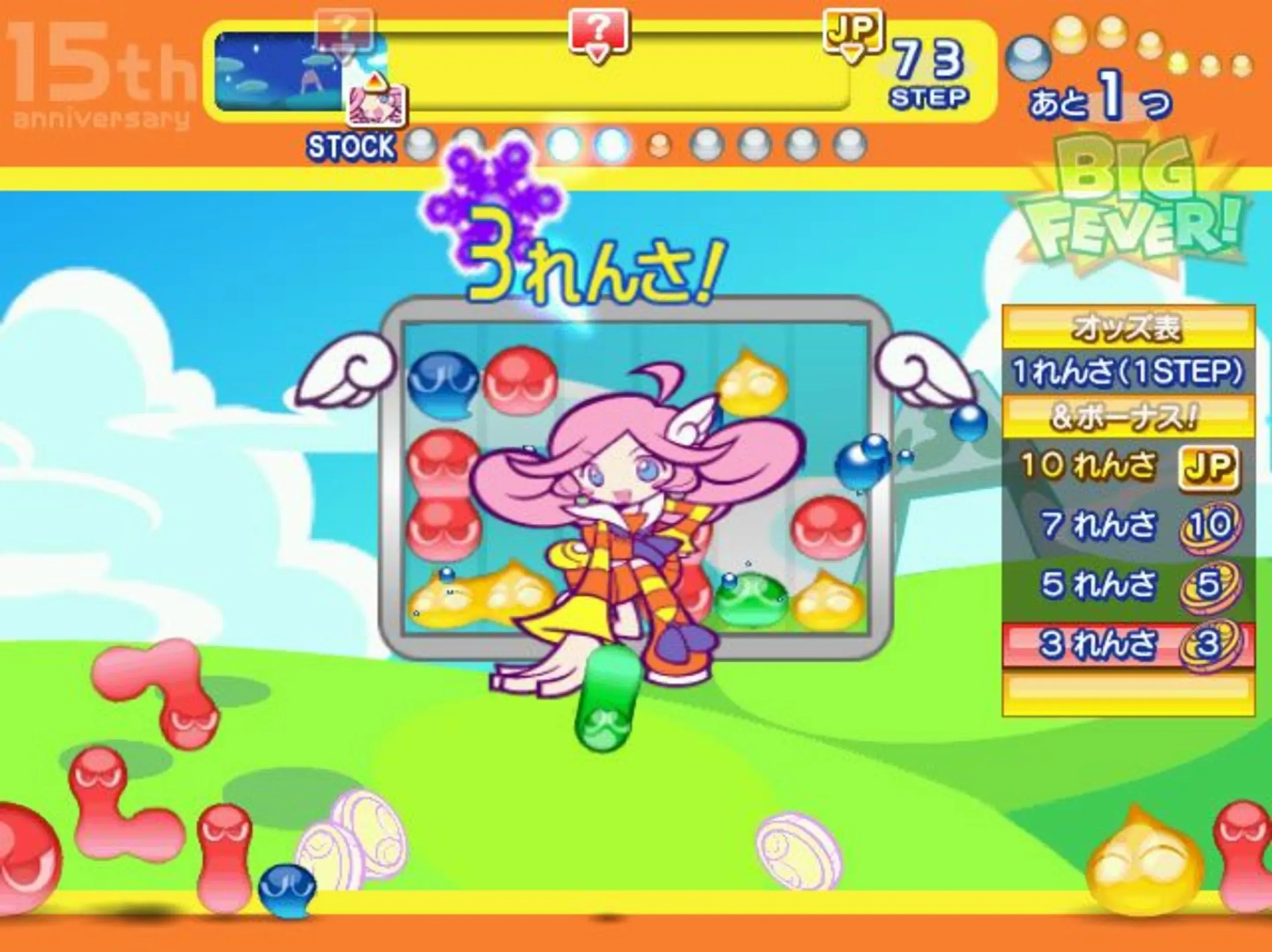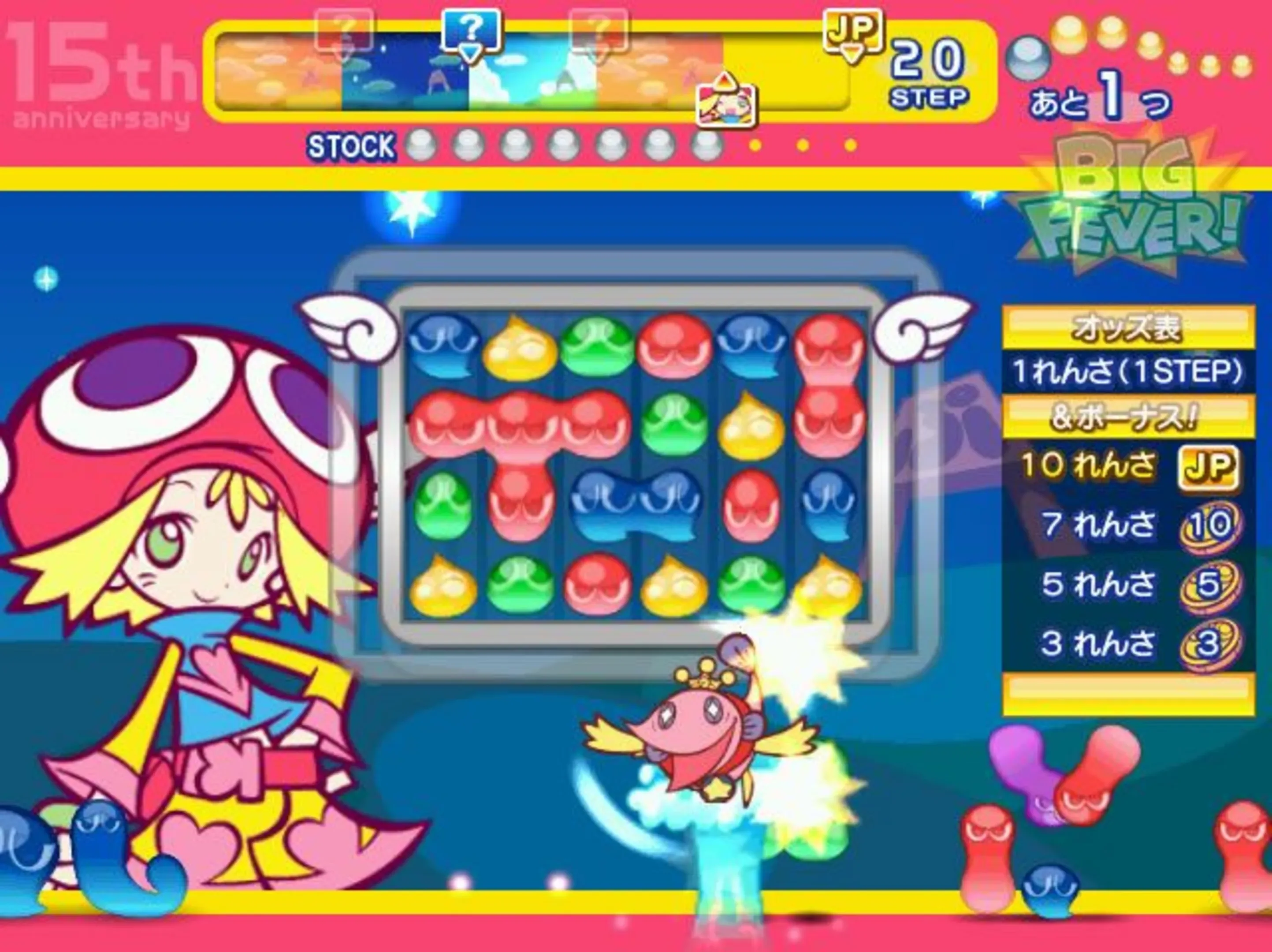 The game revolves around using coins to hit on-screen Puyos to enlarge them and then pop them to start off a shuffled, filled board of Puyos to pop them in groups of 4 to make chains. Rewards are given out based on the larger the chain is as the player tries to reach the jackpot.