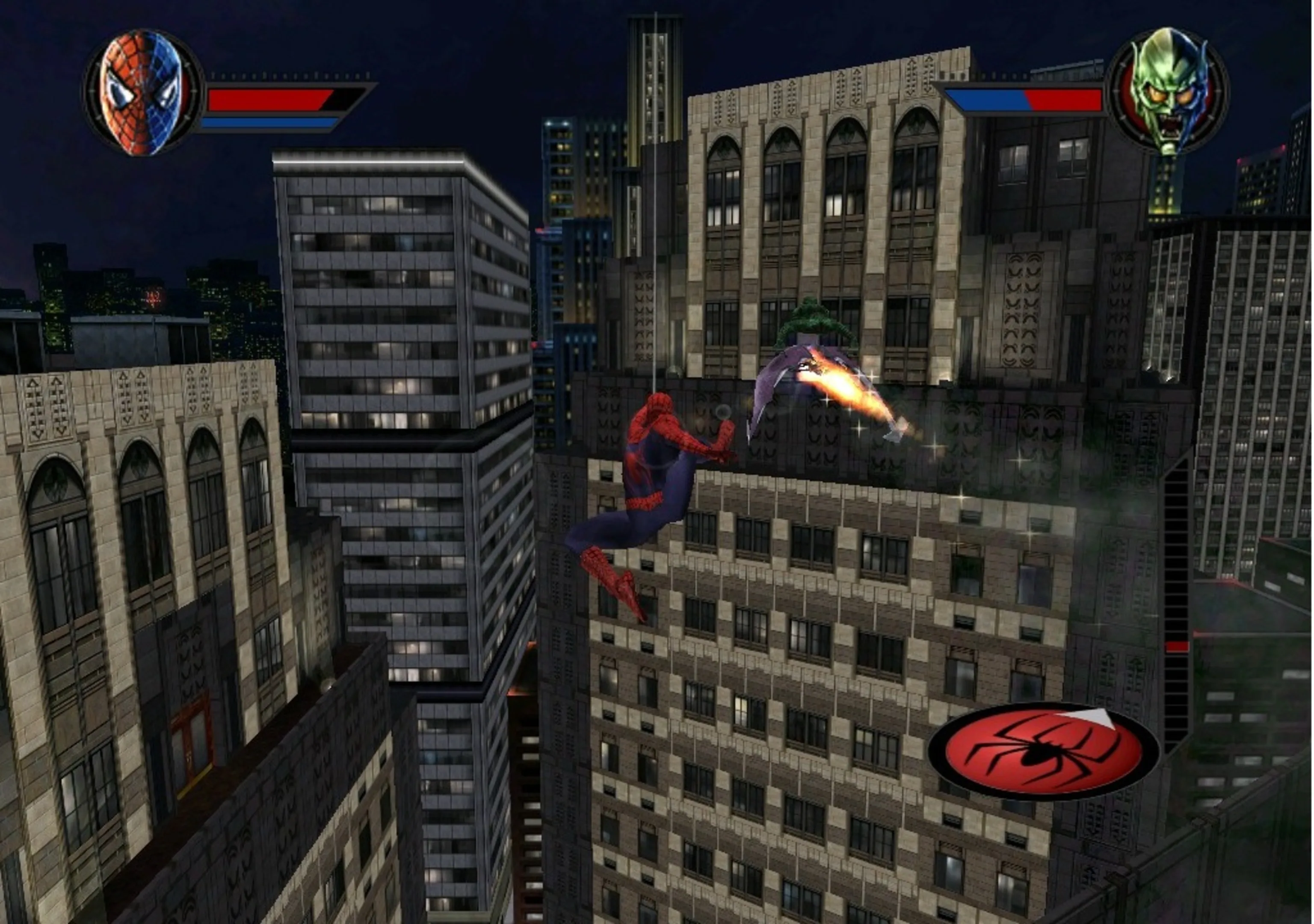Spider-Man is an action-adventure game released in 2002 on the Xbox, Playstation 2, GameCube, Game Boy Advance and Microsoft Windows. Developed by Treyarch and published by Activision, the game has you playing as Spider-Man in the events of the movie while also adding new ennemies like the Shocker and Vulture. The gameplay consists of successive levels where you need to defeat thugs with your fists and web and save someone/something from multiple sources of danger until you reach the boss of the section. You either fight in enclosed environments or swing around New-York City in "aerial" sequences.