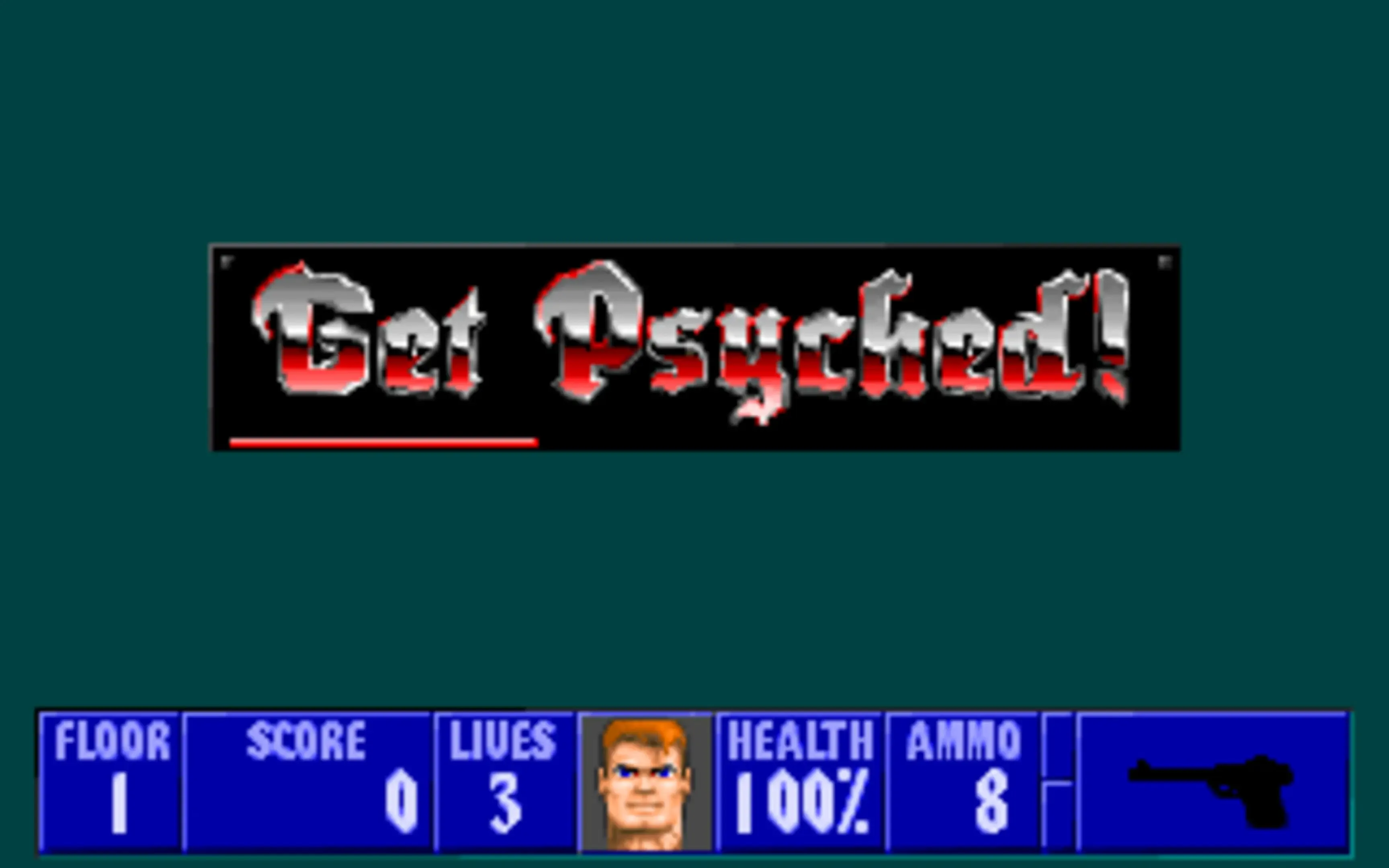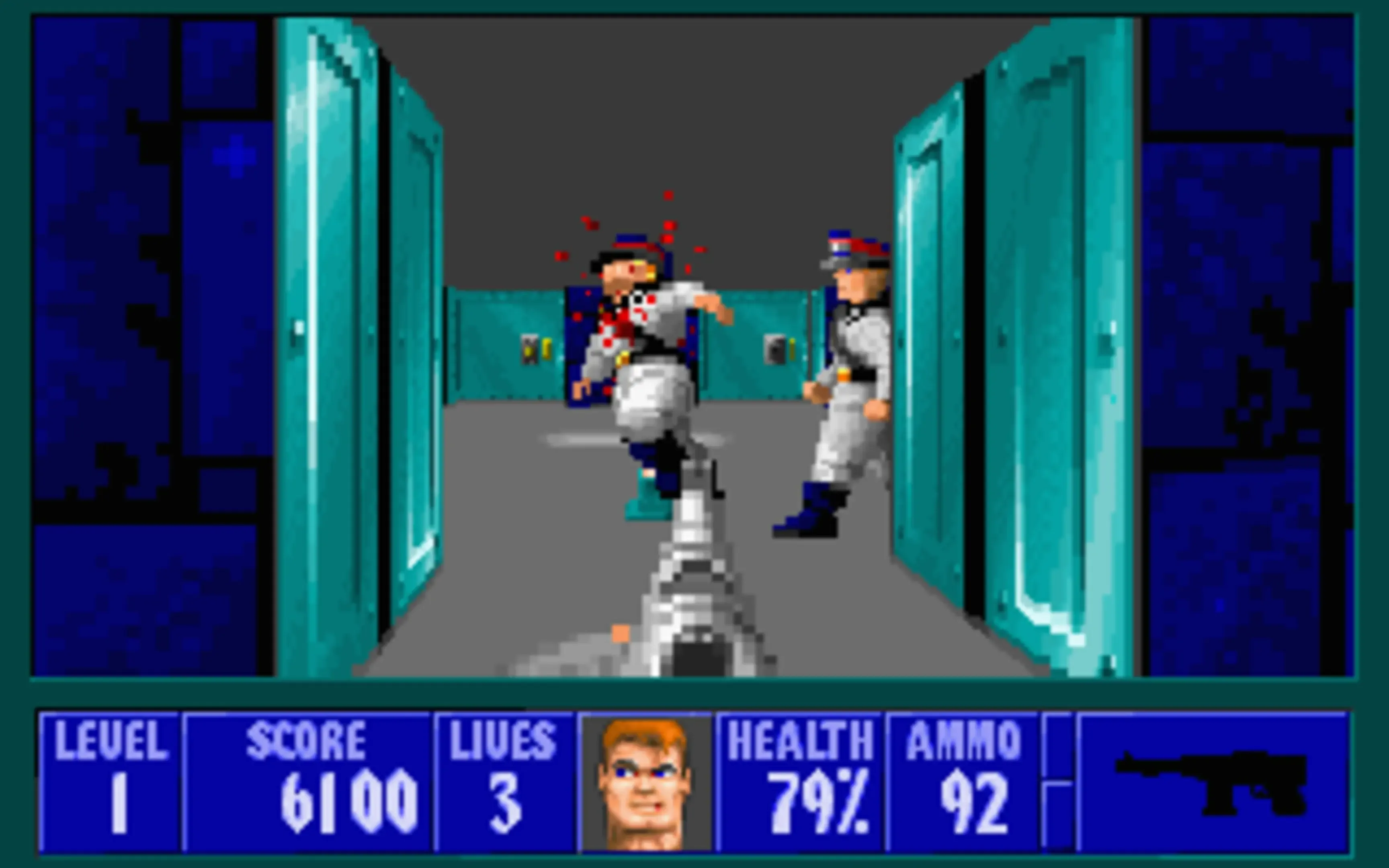 Wolfenstein 3D is a first-person shooter presented with rudimentary 3D graphics and a follow-up to the top-down infiltration game Castle Wolfenstein. The game is broken up into levels, each of which is a flat plane divided into areas and rooms by a grid-based pattern of walls and doors, all of equal height. Each level is themed after Nazi bunkers and buildings. To finish a level, the player must traverse through the area to reach an elevator. Levels are grouped together into named episodes, with the final level focusing on a boss fight with a particularly difficult enemy. While traversing the levels, the player must fight Nazi guards and soldiers, dogs, and other enemies while managing supplies of ammunition and health. While later releases of the game included the Nocturnal Missions expansion, this initial release did not.
