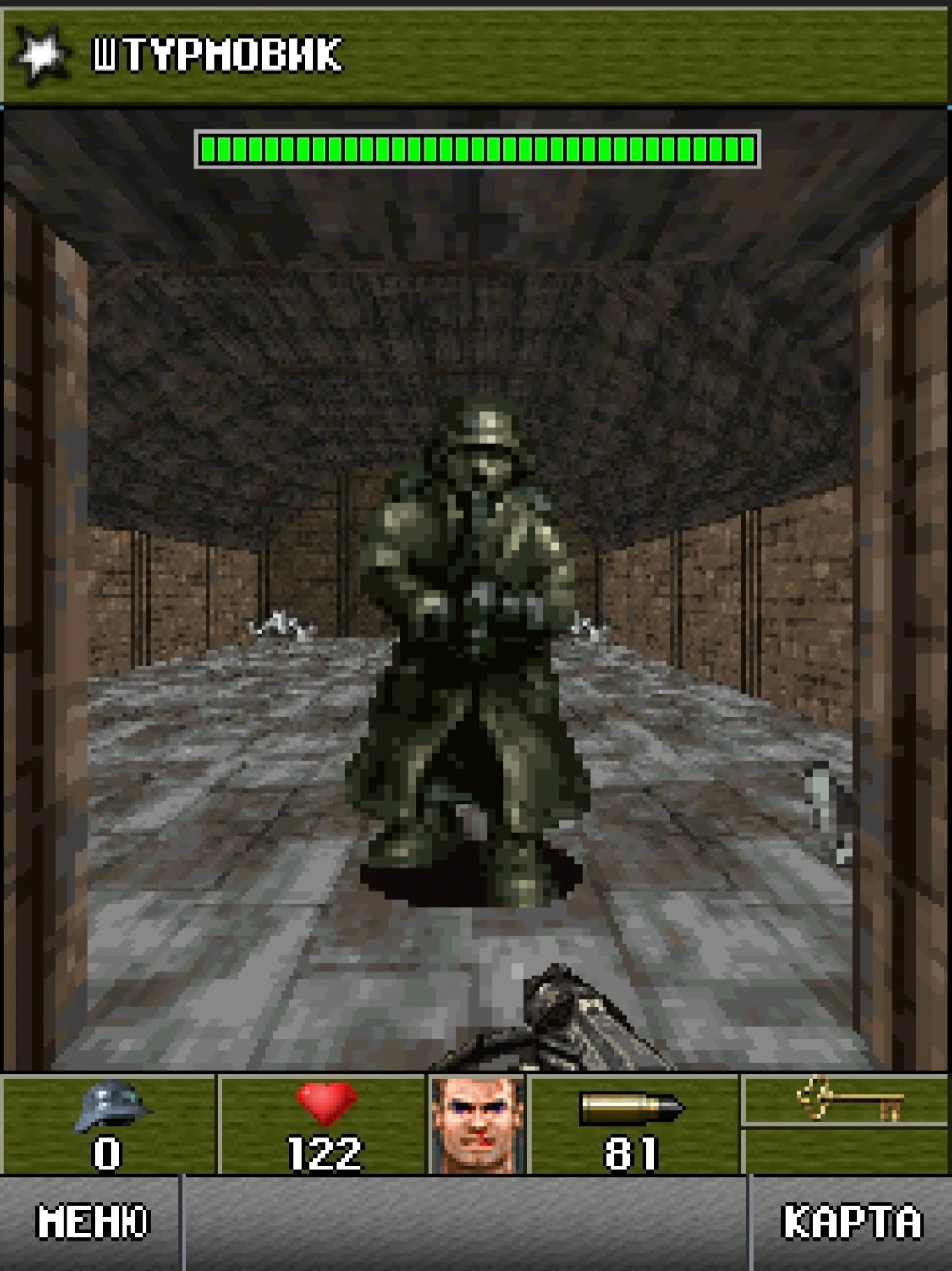 Wolfenstein RPG is a first-person shooter and role-playing video game developed by id Software and Fountainhead Entertainment, released in September 2008 for mobile phones and in May 2009 for iOS. In 2013 the game was removed from App Store. The gameplay follows the recipe from Doom RPG as it is shown in the first person while being a turn-based role-playing game rather than a shooter and puts emphasis on the plot. Combat and movement are turn-based, allowing the player time to select their responses in combat. The player turns at 90 degree angles and moves space by space. One step or action by the player allows all other characters in the area to take one step or action themselves. The game takes advantage of its deliberately slow pace, encouraging players to take their time and check out every little corner, read the books on every bookshelf, and destroy all the furniture to see if anything is hidden within. Levels include underground passages and weapon development laboratories plus a level involving a moving vehicle. The game also includes two mini games: the card game War as well as Chicken Kicking, where the player is awarded points for kicking a chicken into a score area.